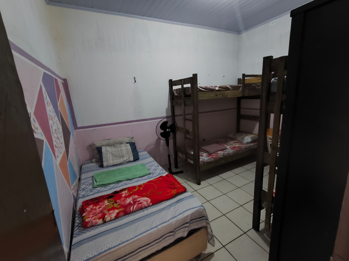 Quarto independente em um local tranquilo e bem localizado. Quarto para 01 pessoa com ventilador, banheiro privativo com blindex, televisão, wi fi, mesa para trabalho, piso com porcelanato e ambiente familiar. Próximo a supermercados, farmácias, ponto de ônibus, banco e parque da cidade.