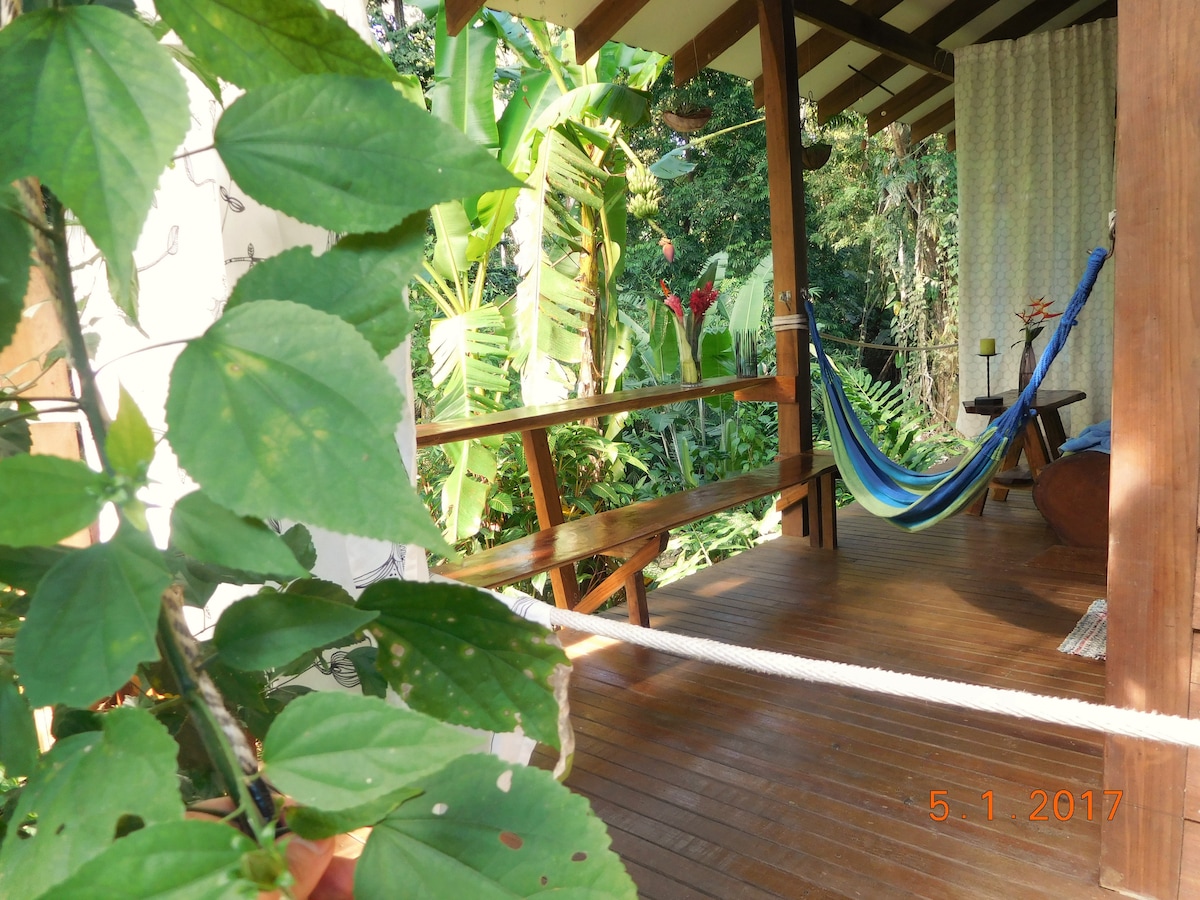 Stylish apartment made of tropical wood with big terrace overlooking a creek and the lush jungle.Hot water, equipped private kitchen,wi-fi, car parking,hammock,tour desk,bicycle rental,big garden with animals around.Your neighbors will be tucans,sloths,iguanas and lots of humming birds and butterflies. Do morning yoga on your deck overlooking the creek and toast the evening from this fabulous deck.