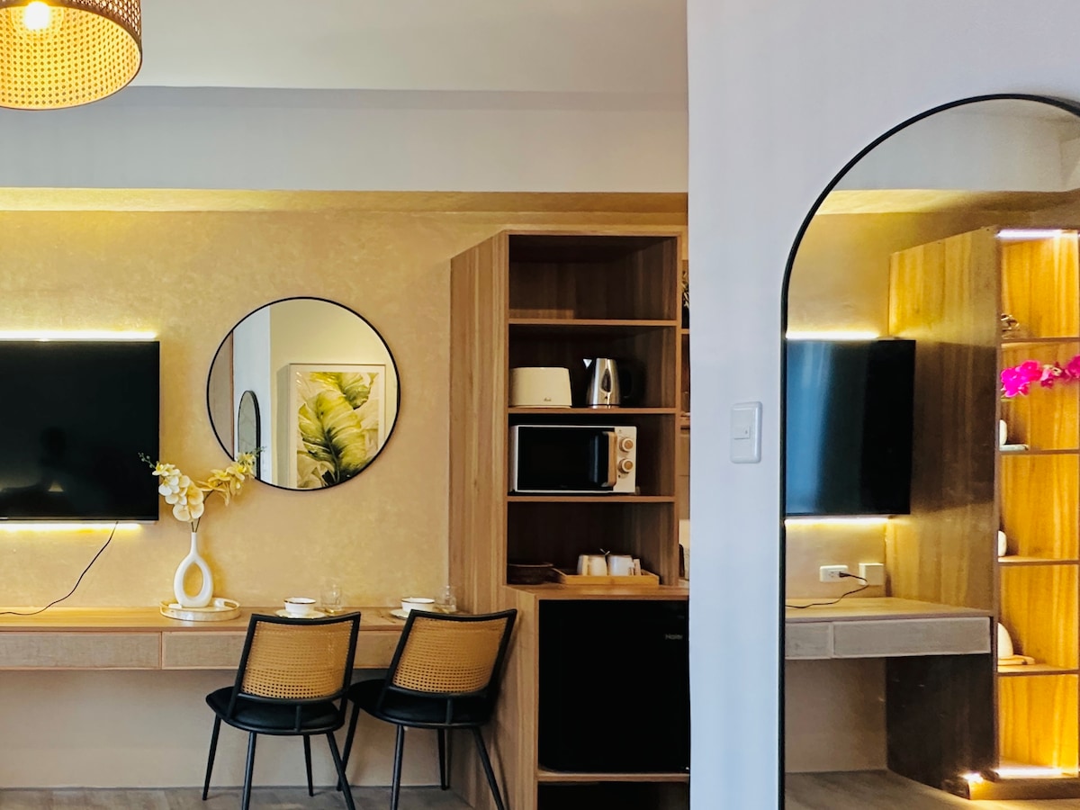 16층에 자리한 이 아늑한 스튜디오는 바콜로드의 스카이라인과 바다의 탁 트인 전망을 자랑합니다. 창문으로 들어오는 황금빛 햇살에 잠에서 깨어나고, 별이 빛나는 샹들리에 아래에서 휴식을 취하고, 부드러운 침구에서 잠을 청해보세요. 따뜻한 나무 책상에서 일하거나 일기를 쓸 수 있습니다. 도시보다 고요함을 찾는 나홀로 여행자나 커플에게 완벽한 숙소입니다. 아담하고 조용하며 잊을 수 없는 숙소입니다.