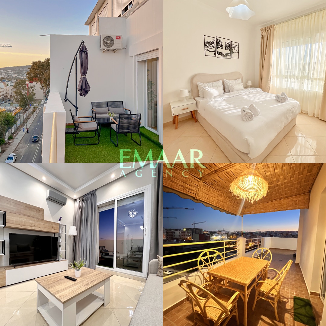 Spacious and bright apartment in the heart of Tangier, Aida district. Two comfortable bedrooms, a fully equipped kitchen, and a functional bathroom. Large terrace with two façades to relax or enjoy the sunset. 5th floor with elevator, air conditioning, Wi-Fi, storage, and games. Central location near shops, restaurants, and attractions. Ideal for travelers seeking comfort, space, and a terrace with a view.