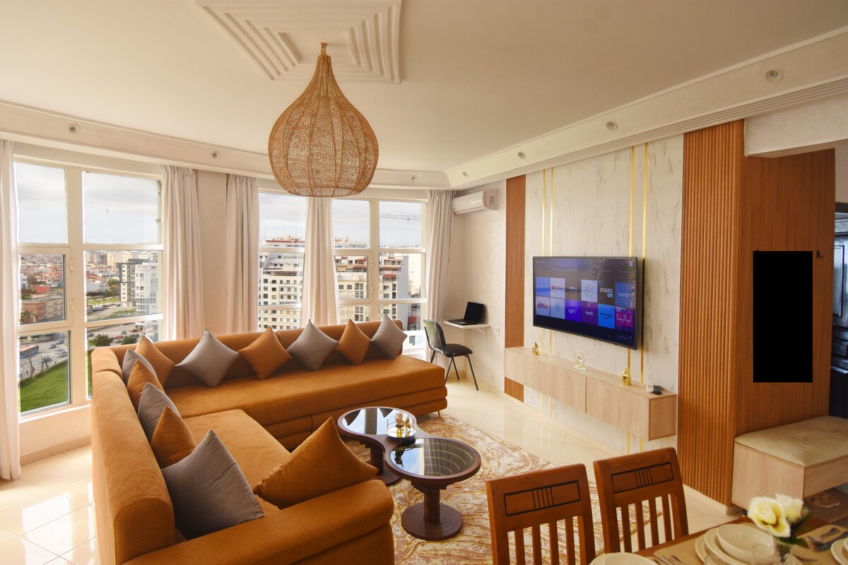 Welcome to our brand new two-bedroom apartment located in a prime area of Tangiers. This upscale property is situated in one of the most sought-after areas in the city with 24-H concierge & is only a 10 min walk from the Train Station, City Centre Mall, Ibn Battuta Mall and beaches. It offers both convenience and luxury at your doorstep. Private parking available. The apartment boasts: fibre optic WiFi, an option for chauffeur and a Moroccan breakfast prepared by our governess (additional cost)