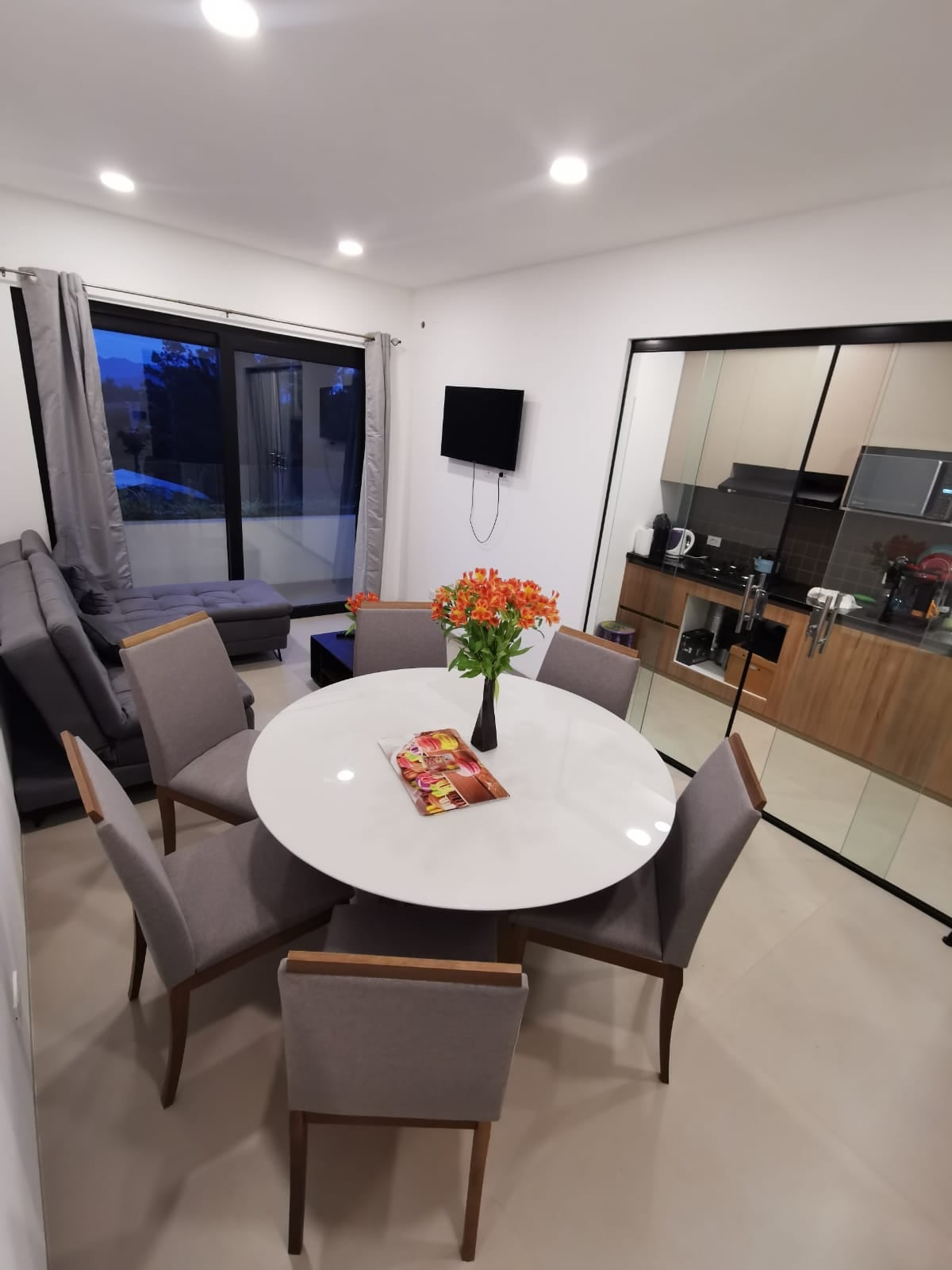 Edificio nuevo con gimnasio y cafetería, ubicado al frente del campus de la universidad. Departamento con vista de la ciudad, equipado, a tres minutos del centro de la ciudad en vehículo, con patio de comida, bancos, farmacias y otros servicios en los alrededores.