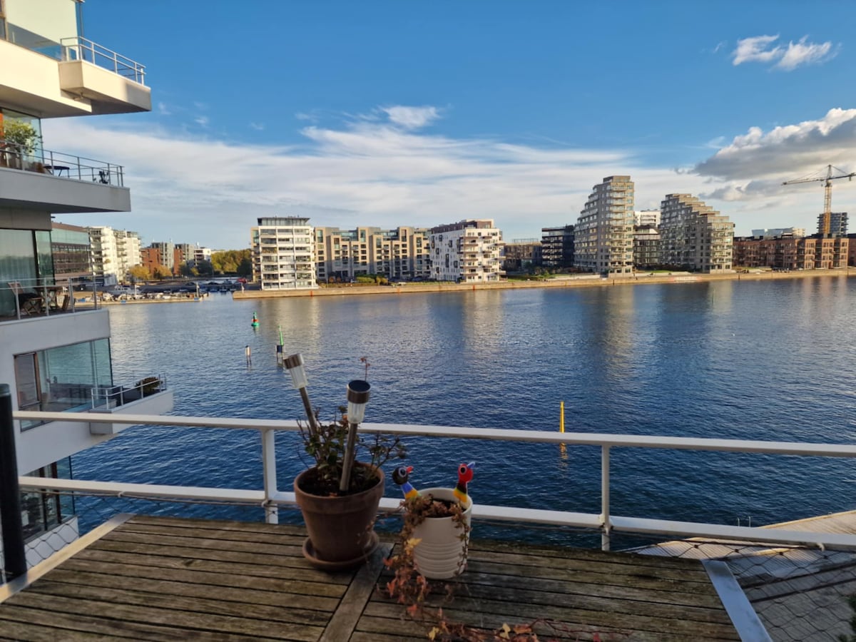 Ny og stilfuld lejlighed med smuk udsigt til Københavns kanaler fra alle rum Lejligheden egner sig til gruppen som ønsker en rolig og afslappet ferie i smukke omgivelser. På altanen kan et glas vin nydes. Hvis man er frisk, kan man tage en dukkert i havnen. Med 10 minutter på cykel er man i centrum. Få minutters gang kan I tage havnebussen og sejle rundt i København. Togstationen er omkring 1 km fra boligen.