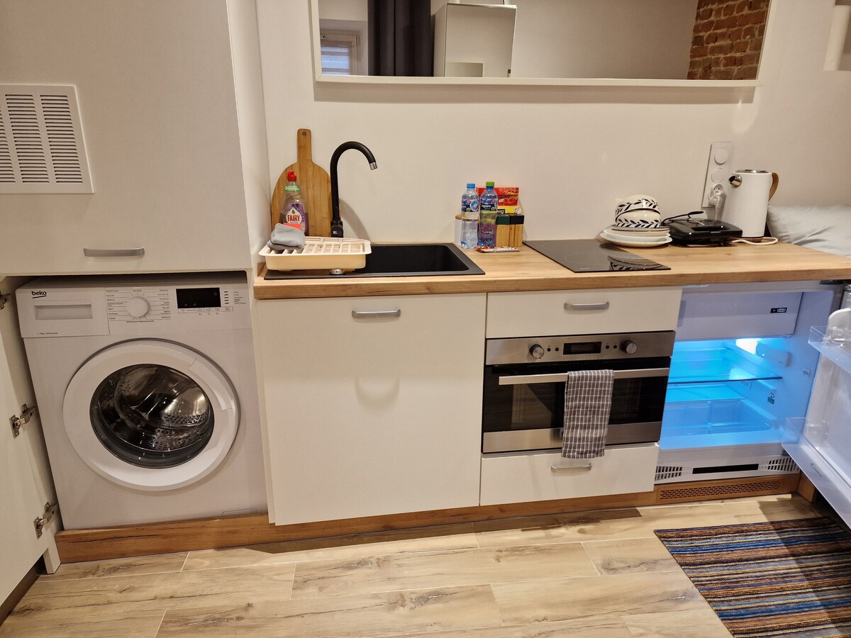 Mam przyjemność przedstawić Państwu apartament z klimatyzacją, studio 20 m2 w samym centrum miasta Lublina. Znajduje się na parterze w kamienicy. Duża wygoda, bez konieczności noszenia walizek. Wyposażony w szybki światłowód i Wi-Fi, Netflix, 80 kanałów i Canal+, wygodne łóżko 140x200 z materacem Ikea, pralka, lodówka, kuchenka indukcyjna, mikrofalówka, czajnik, toster, żelazko + deska, pełne wyposażenie kuchni oraz czyste ręczniki i pościel. Kawa, herbata i woda dla gości.