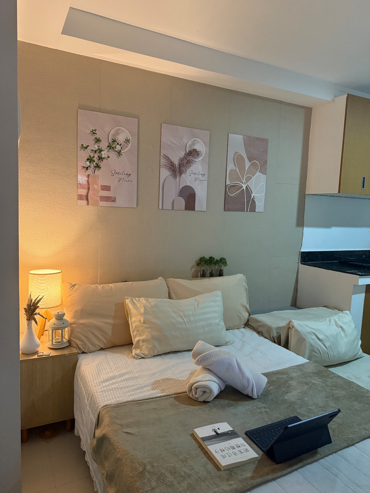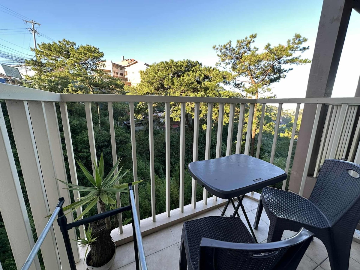 세션 로드와 SM 바기오에서 단 2분 거리에 위치한 4인용 임시 숙소 스튜디오 타입 콘도입니다. 냉장고, 전자레인지, 밥솥, 인덕션 쿠커, 전기 주전자, 빵 토스터, 에어프라이어, 전기 선풍기, 텔레비전, 와이파이 등 가전제품이 완비되어 있습니다. 요리가 가능합니다.