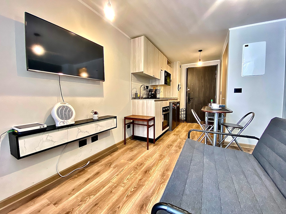 산티아고 중심부에 위치한 이 독특하고 조용한 휴양지에서 휴식을 취하세요. 아늑한 스튜디오 환경은 뉴욕의 활기찬 도시에서 영감을 받은 오아시스로, 도시의 우아함과 편안함, 스타일이 조화를 이루고 있습니다. 도심에 위치한 특권 위치를 즐기세요. 도보로 몇 걸음 거리에 토에스카 지하철과 알마그로 공원을 포함한 대중교통 연결이 훌륭합니다. 저희 스튜디오는 초고속 인터넷과 에어컨이 갖춰진 완벽한 안식처입니다.