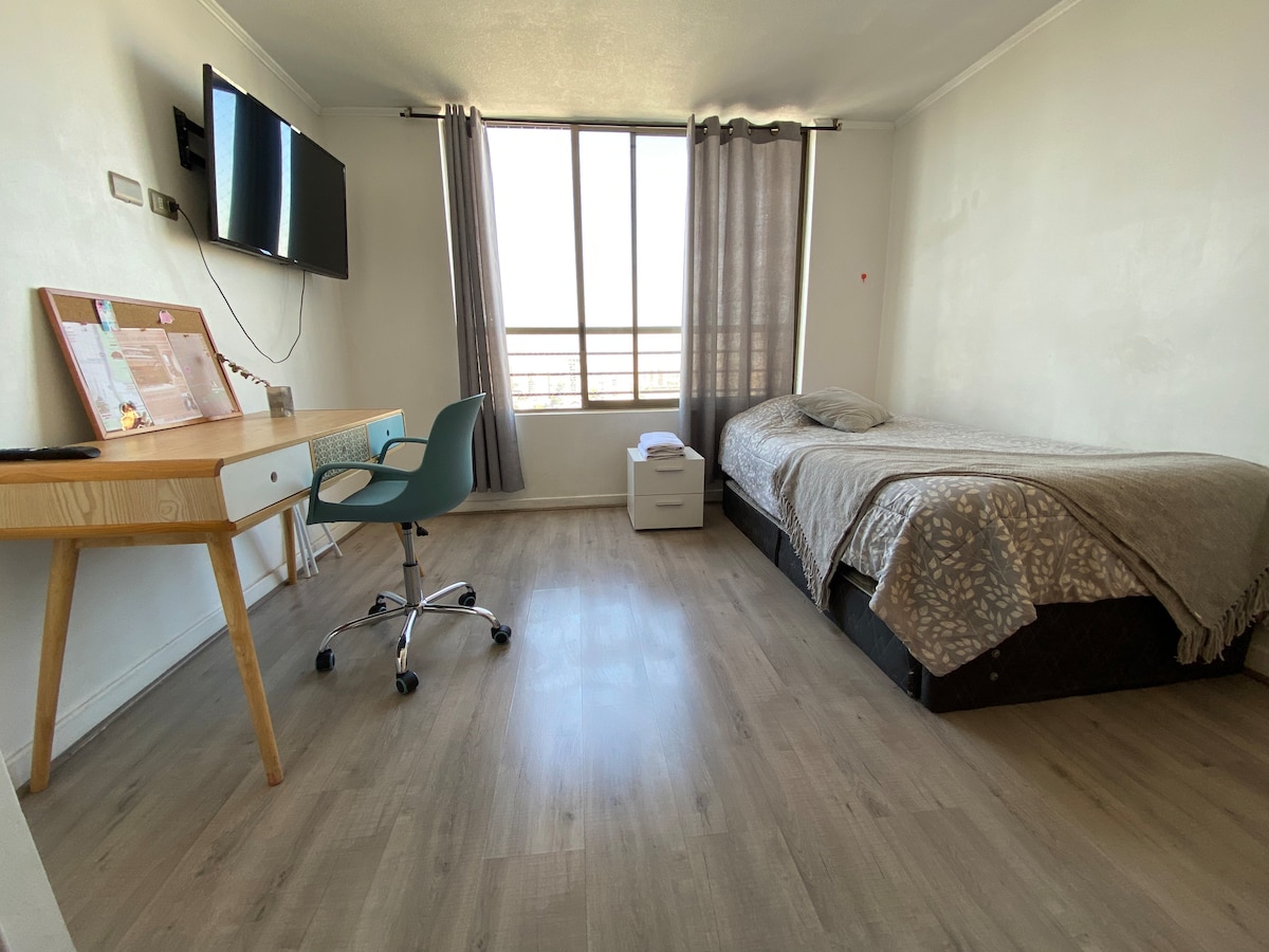 Amplio y luminoso departamento en el corazรณn de Santiago ๐. Ideal para viajeros que buscan comodidad, independencia y una gran vista a la ciudad. Con diseรฑo cรกlido y funcional, ofrece Wi-Fi rรกpido, Smart TV y cocina equipada. Somos un alojamiento sustentable, fomentamos el uso de transporte pรบblico y reciclamos. Ubicado cerca del metro, cafรฉs, museos y atractivos turรญsticos para disfrutar Santiago a pie con total confort.