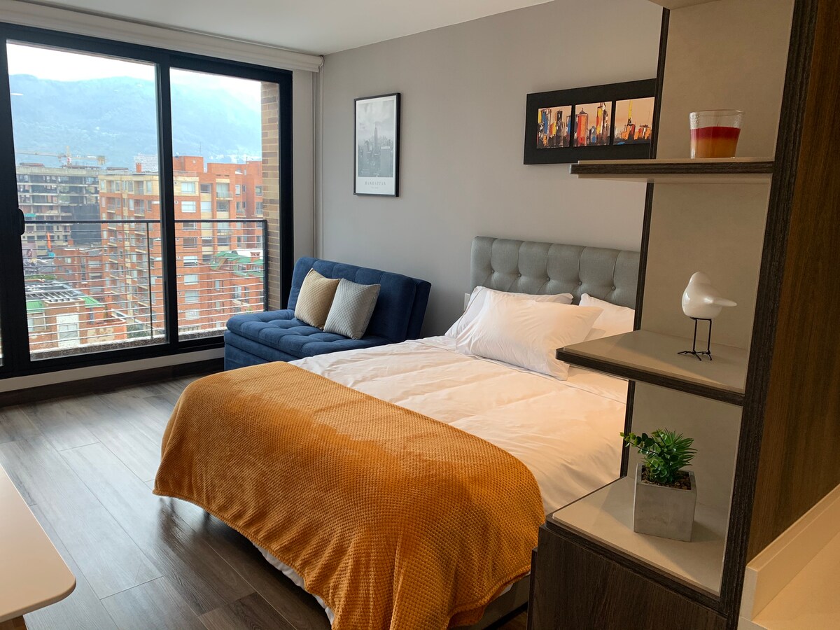 Apto de 17 mts2 tipo hotel, con todas las comodidades para ti y tu pareja. Cerca a las prestigiosas clínicas del norte de Bogotá, ubicado en la autopista norte con calle 95. Estación de transmilenio a pasos del edificio, servicio de patineta eléctrica. Cerca a bancos, clubes, centros comerciales, etc. Especialmente diseñado para una estadía de trabajo. Se cuenta con wifi y tv por cable, cocina, microondas, calentador, lavaseca, totalmente equipado con tv, radio Bosé, cubiertos, ollas, etc.