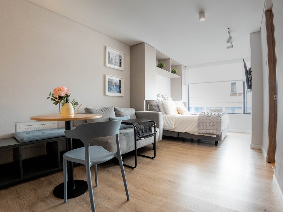 Minisuite, moderna, única con lindo patio privado . Silla ergonómica para home working. INGRESO AUTÓNOMO FACIL Y SEGURO a cualquier hora. wifi veloz. Junto a Clínica Dalí y Nogales, a Clínica Barraquer, oftalmológicas, estéticas, y pasaportes. En el corazón empresarial de la ciudad. Dotación completa para : cocinar, lavar, secar ropa, trabajar, estudiar y descansar, guarda equipaje por 24 h. Atención permanente e inmediata a nuestro huésped. Seguridad 24 horas.