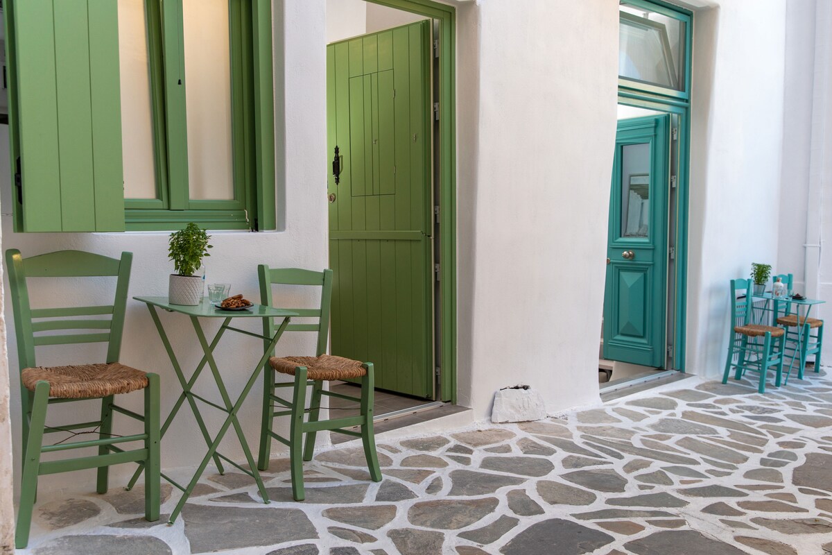 최대 5명의 게스트를 수용할 수 있는 독특하고 아름다운 아파트로 아름다운 전용 파티오와 예술적인 감각이 돋보이며, 낙소스 타운 중심부의 아름다운 동네에 위치해 있습니다. 항구에서 도보로 10분, 시장 및 기타 관광지(성, 박물관 등) 및 오락지(바, 레스토랑 등)에서 1~2분 거리에 있습니다. 차량 없이 여행하는 경우 걱정하지 마세요. 가장 인기 있는 해변과 마을에서 가장 가까운 버스 정류장은 도보로 3분 거리에 있습니다. 도보로 3분 거리에 무료 주차장이 있습니다!
