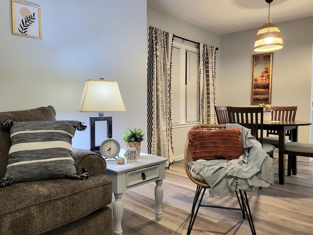 저희 숙소가 마음에 드실 겁니다. 후기를 읽고 직접 확인해 보세요!! 중심부에 자리하여 입지적 편리함과 세련된 스타일을 모두 갖춘 공간입니다. 침실 1개와 욕실 1개를 제공합니다. 침실에는 퀸사이즈 침대가 있고 소파에는 메모리폼 퀸사이즈 풀아웃 침대가 있습니다. 식사 공간에 책상을 추가하고 주방에 귀여운 커피 바를 추가했습니다. 흔들의자에서 휴식을 취하며 둘러싸인 현관을 즐길 수 있습니다. 주방 바깥에 풀 사이즈 세탁기와 건조기가 있습니다.