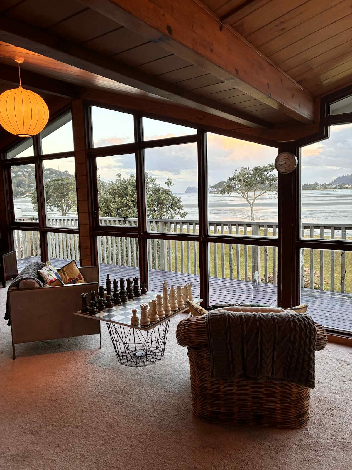 코로만델의 고급 통나무집. 멋진 바다 전망.