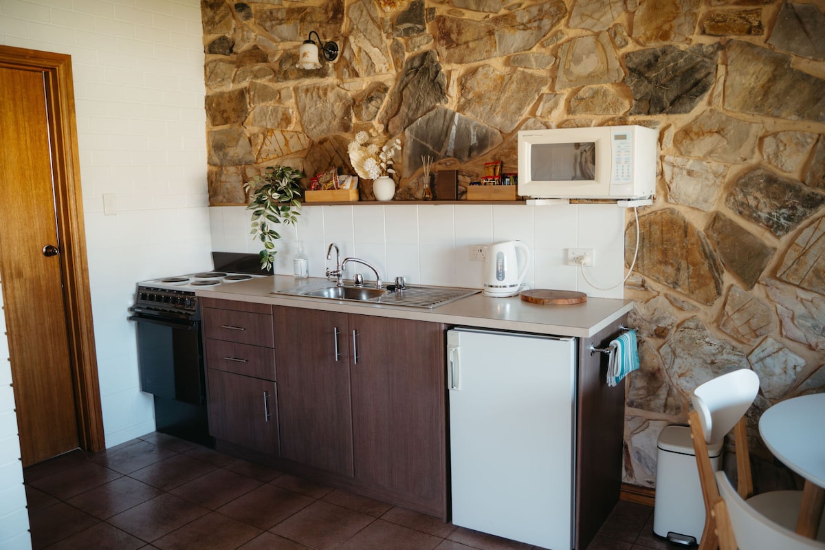 Unwind in this delightful, inclusive & accessible studio on a hobby farm in the Barossa Valley, close to the Adelaide Hills, historic Gawler, 40min from the beach. Drawing on Barossa heritage, it showcases reclaimed corrugated iron walls & roof. Warm yet roomy & comfy: queen bed, kitchenette, aircon+ceiling fan. Breakfast supplies. Wheelchair ramp, wide doors. Views of vineyard, nature, garden. Picnic spot, bush trails, wineries nearby. LGBTQ+ welcoming. Perfect for romance or a quiet break.