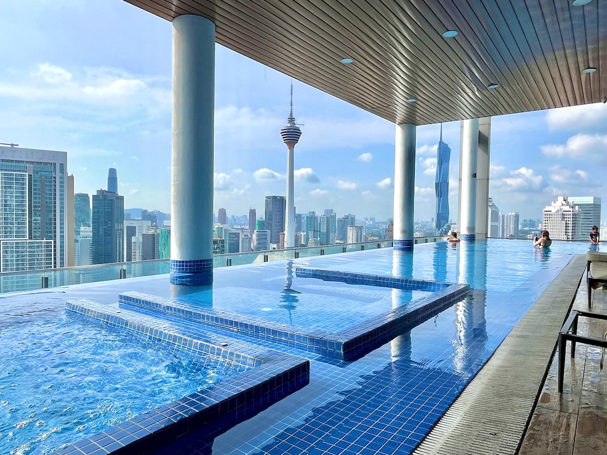 1BR suite located within the KL Golden Triangle! Centrally located 5-10mins away from: •Famous shopping centers at Bukit Bintang area - -Berjaya Times Square, LaLaport BBCC -Pavilion, Starhill -Lot 10, Sg Wang -Suria KLCC •Changkat Bukit Bintang bar street •Jalan Alor Food Street •KL Tower •China Town •Monorail & LRT (Hang Tuah Station) •KL bus terminal (Pudu Sentral) Our place is very suitable for family, couple or a group of friends. Our infinity pools overlook the stunning Merdeka 118 tower.