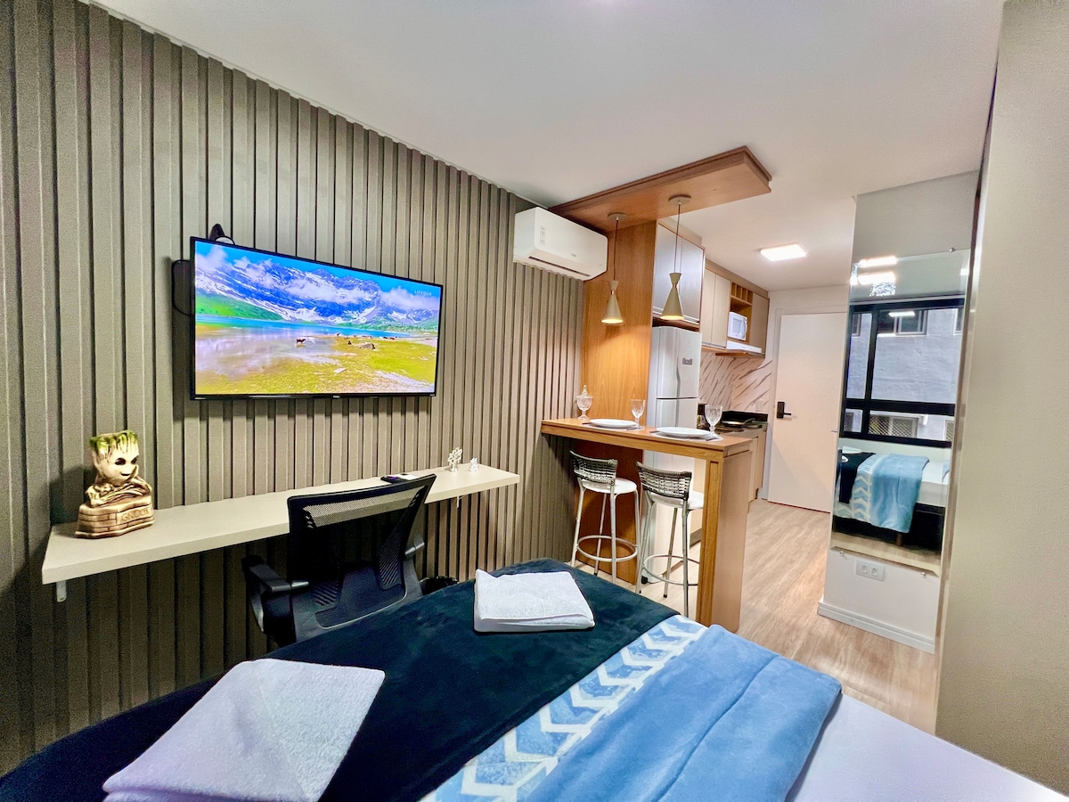 Studio moderno, novíssimo, aconchegante, perfeita localização, com uma linda vista da sacada, principalmente a noite . Wi-Fi rápido, mesa de trabalho, TV smart 55” , cama Queen. Ar condicionado (quente/frio). Máquina de lavar e secar roupa e uma linda ilha na cozinha. 50m2 de muito estilo-27ºandar, Silencioso. No Centro/Batel, próximo à comércios, bancos, shoppings, polo gastronômico e Hospital . No prédio :Piscina, academia, sala de jogos, sauna, jacuzzi, portaria 24 horas.