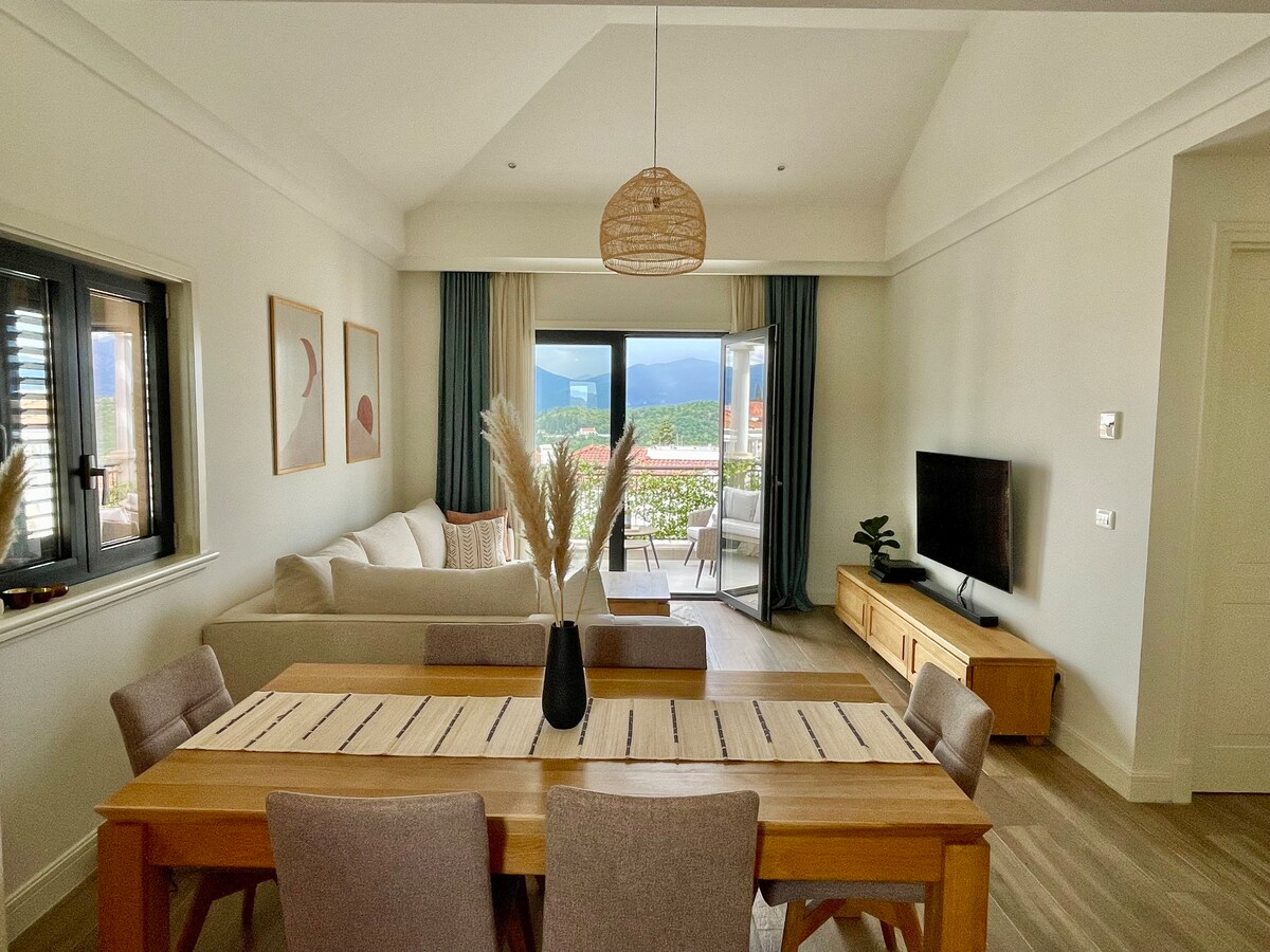 Enjoy your stay in this cozy and stylish 2-bedroom apartment with access to a shared heated pool, gym, and free parking. Relax in the modern living room or cook your meals in the fully equipped kitchen. Located in a peaceful area full of natural beauty, it's perfect for a relaxing getaway with walk distance to the beach. With a modern bathroom and all essentials provided, it’s ideal for couples, families, or friends. Book now for comfort and calm with nearby to Porto Montenegro/Center.