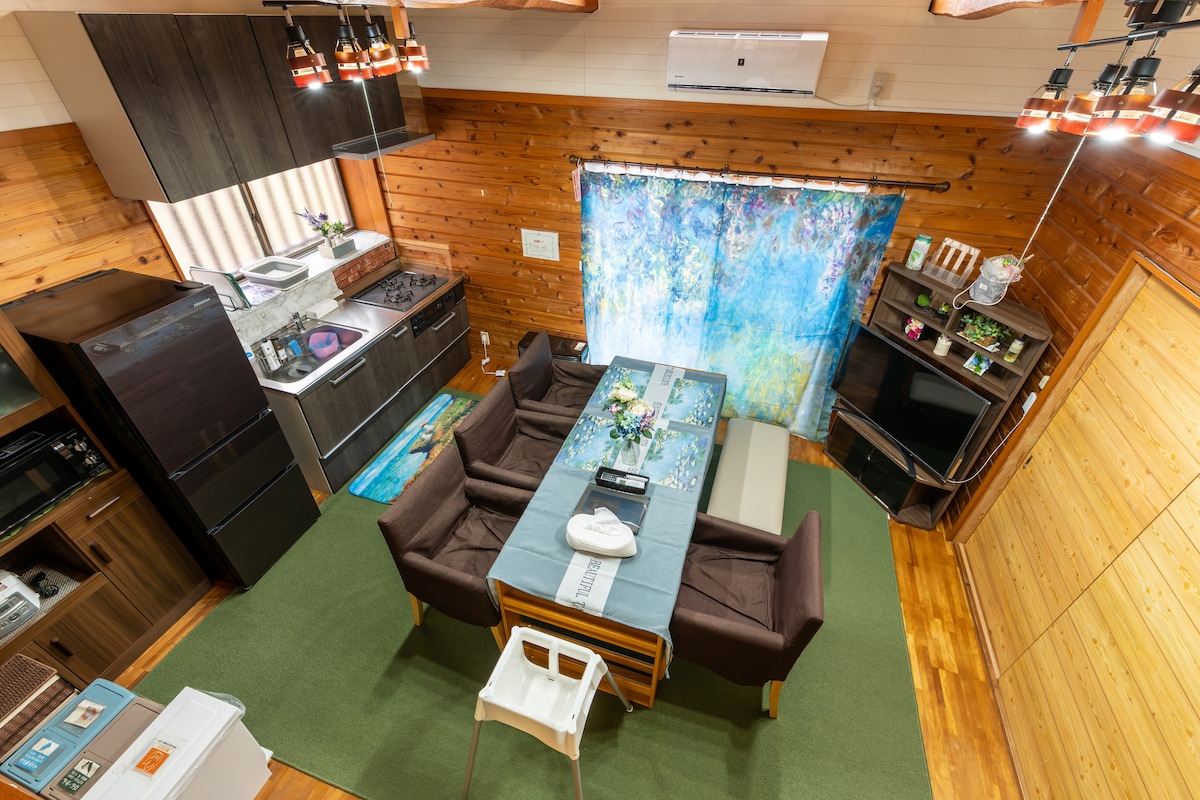 那須を遊び尽くしましょう! 遊園地からすぐの高台に位置するこの別荘は、200平米ある広々とした開放感ある空間です。 リビングには大きな木製すべり台を設置。隣にはボルダリング、壁が全部磁石の創作スペース。65インチあるテレビは、なんとゲーセンにある「本物の」太鼓の達人の太鼓を設置。ゲームセンターの大きな太鼓で遊び放題叩いてみませんか?曲もすべて解放済みです。もちろんネットも完備。 そして巨大な岩風呂があります。大人数でも一気に入れます。お子さまのプール代わりにも。脱衣所も広く取っていますので、ゆっくりとおくつろぎいただけます。 洗濯機に加えてガス乾燥機がありますので、洗濯物もすぐに乾きます。 屋根がある広々とした屋外バーベキュースペースで、本格的なバーベキューも、天候気にせずに楽しめます。屋台風の明かりもあり、夜のバーベキューもお楽しみいただけます。グリルはアメリカ製のガスグリル。炭などを持ち込む必要は全くありません。 寝室は3部屋ご用意。ご家族で別々でお泊りいただけます。 この広々別荘「ブルーツリー」で、お家でも思いっきり楽しんで、那須をまるごと楽しんでくださいね。