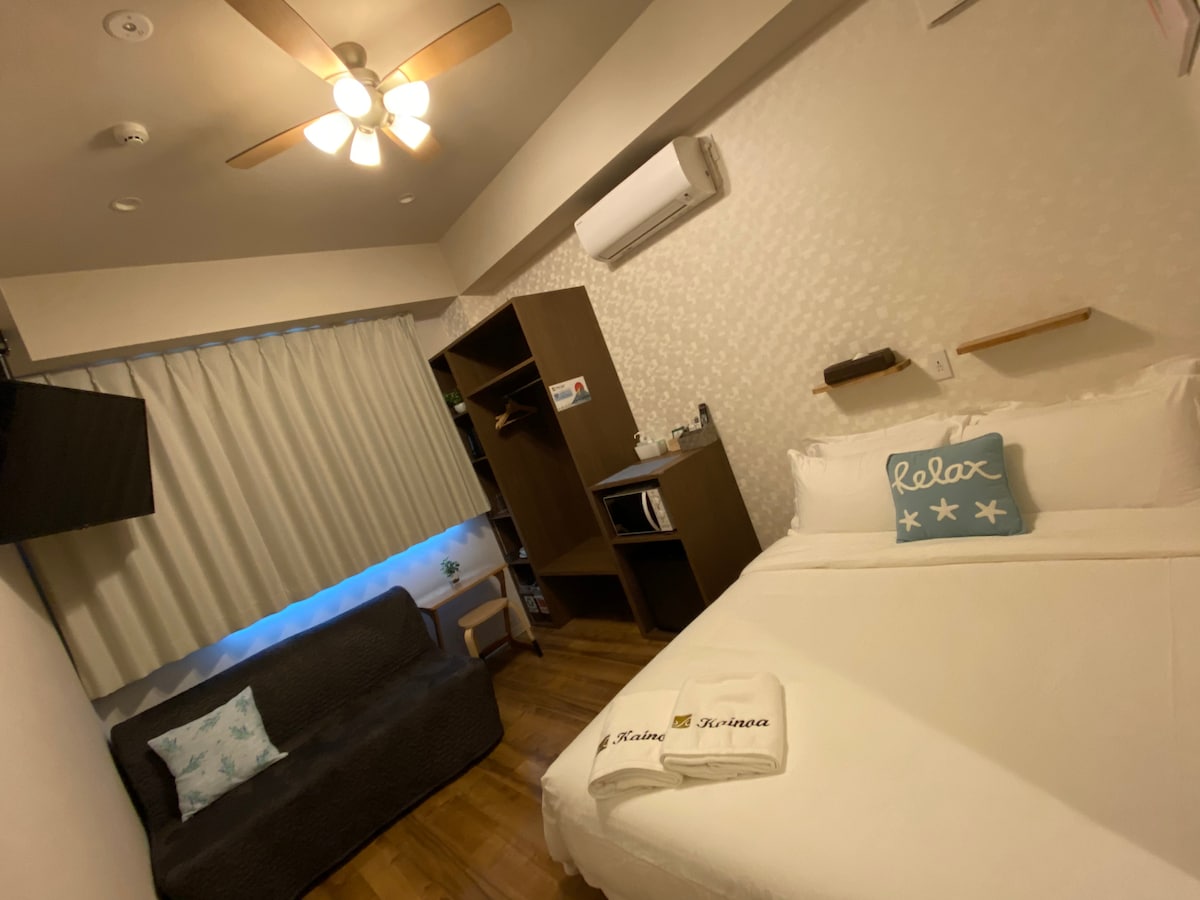 Newly built with travelers in mind. The rooms are spacious with Queen size beds (practically unheard-of in Japan). Smart TV - NETFLIX, Wi-Fi, tea and coffee. The bathrooms are fashionable, with large walk in rain showers. LED mirrors to get you ready for whatever lighting you will encounter. Rooms have a bar fridge, microwave and kettle for you to store and prepare ready-made meals and drinks. All rooms come equipped with Air-conditioning, ceiling fans and black-out curtains. Ample storage!