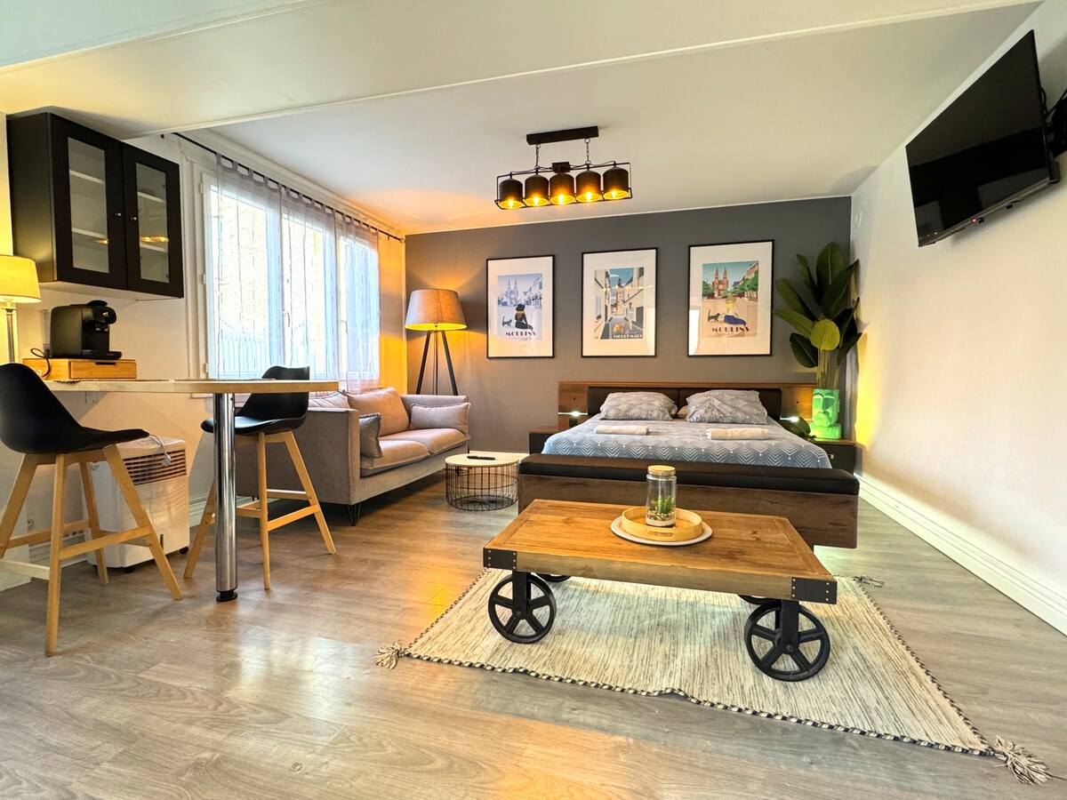 Séjournez à « l’Atelier de l’Artiste » et profitez des charmes de Moulins et ses alentours dans cet appartement idéalement placé. Ce logement atypique, situé au RDC d’un charmant immeuble historique, se compose d’une pièce à vivre avec un coin cuisine et un coin salon, d’une chambre fraîche en été avec un grand lit de 160 et d’une salle d’eau avec WC. La cuisine est équipée, vous disposez d'une connexion WIFI, une TV et un lave-linge.