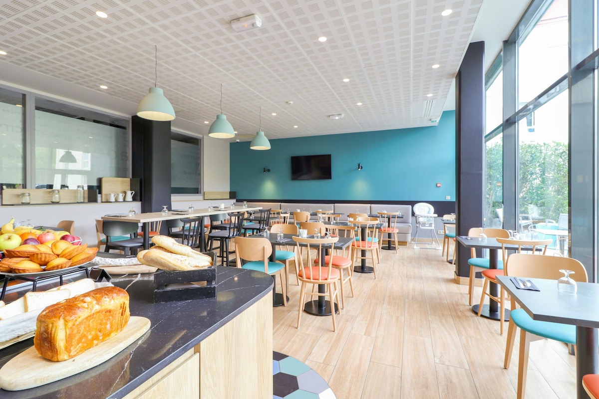 The Residhome Tolosa aparthotel is located between the Blagnac international airport and the historic center, across from Purpan hospital, and near a shopping center. It has direct access to the business, aeronautic, health, and university districts via the ring road. The studio includes: a living room with bed, an office area with a direct telephone line, a fully equipped kitchen (glass ceramic stovetop, refrigerator, microwave, dishes...), a bathroom, a flat-screen television.