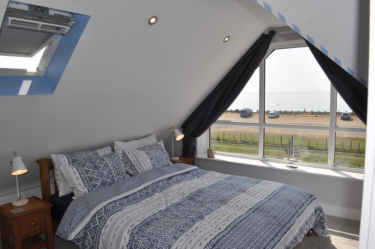 The Beach House, West Wittering Beach. An airy, bright home, shares a garden with the main house, sitting directly on the beach. A perfect getaway, an hour and a half from London. It is self-contained and is close to Goodwood, Chichester Theatre, great bike routes, local pubs and, of course, the sea is on your doorstep. Open-plan fully-equipped new kitchen, big comfortable sofa, TV/Wifi, separate shower room. Super king double bed, plus 2 single beds on large mezzanine floor with a sea view.