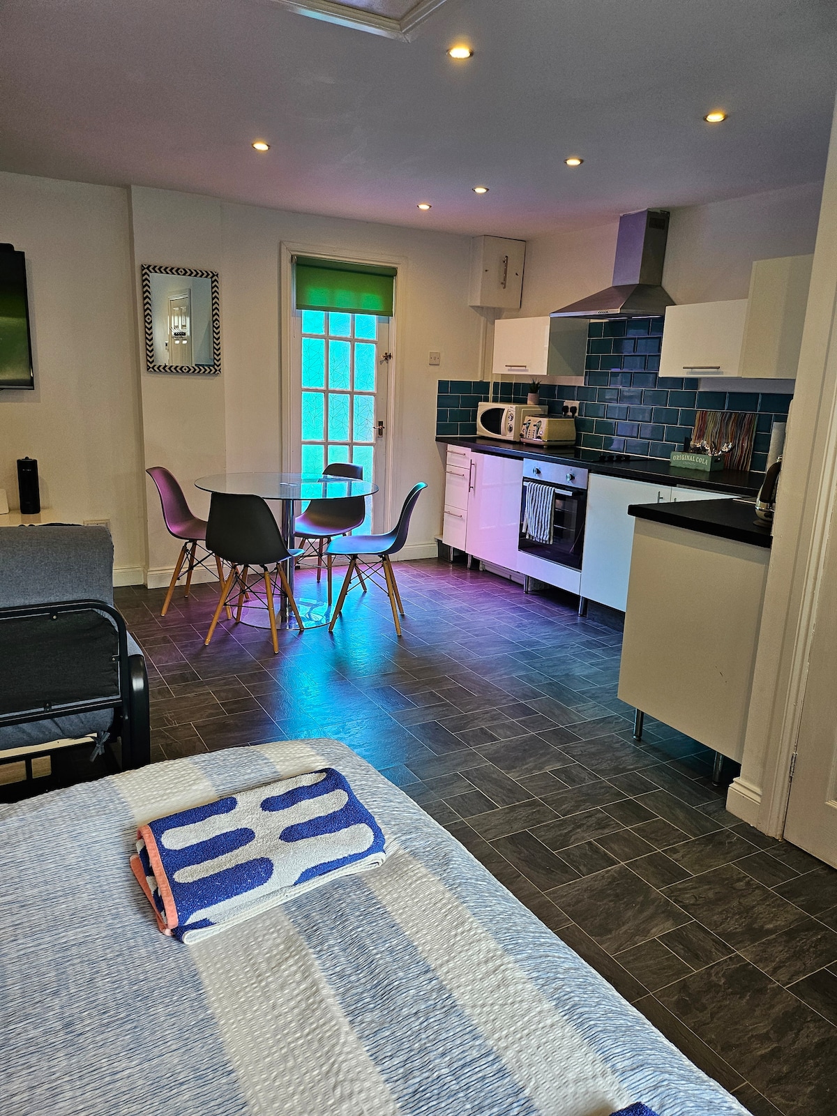 Claudia's stydio is located in respectable quiet road approx 200 m to the beach close to the local shops, ideal for kitesurfing and water sports and Sand parks play areas for children , Cycling track, nature reserves , funfair, BMX track and skatepark, ideal for walks . Indian and Chinese restaurants fish and chip shops Tesco's co-op sainsbury's lidl's are all within a short walk . for use of futon please book for three people as its a added expense