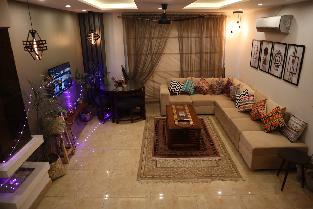 Our one-bedroom apartment combines modernity, comfort and luxury. Fully furnished, well-lit living space with contemporary furniture, a cosy bedroom, and a modern kitchen equipped with all essentials. Step out to cafés, restaurants, and shopping outlets, all within walking distance. ✅ Hosted by a 5-Star Superhost ✅ 24/7 Security & CCTV Surveillance ✅Free Parking ✅15 min Airport Perfect for business travellers, small families or solo guests looking for a premium experience in the heart of DHA.