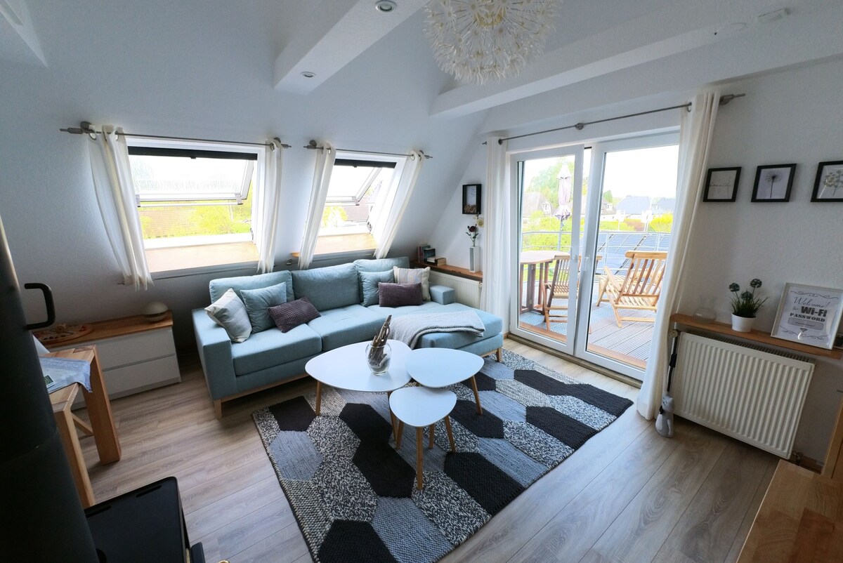 Ein Penthouse, zwei Dachterrassen, vier Balkone, der Blick in alle Richtungen, über die Küstenlandschaft Mecklenburgs bis zum Meer, direkt an der Lübecker Bucht, wenige Schritte zum Naturstrand der Ostsee und doch nicht weit die lebendigen Seebäder Travemünde und Timmendorfer Strand. Einfach wohlfühlen. Mit Kamin und Sauna. Espressomaschine und Weinkühlschrank. Alles in einem entspannten Loftdesign. Eine Oase der Ruhe, ein Genuss für die Sinne. Den Sonnenaufgang vergisst Du nie.
