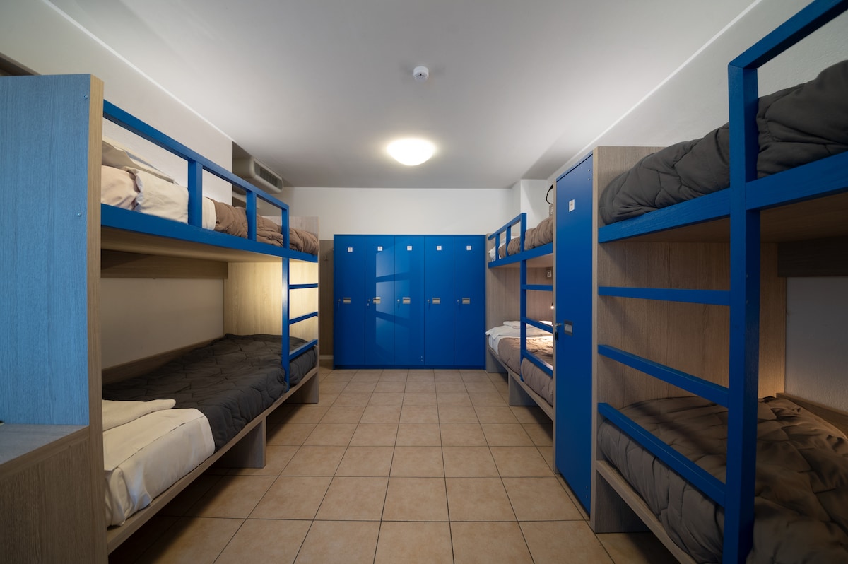 Se desideri vivere in pieno “stile ostello”, potrai scegliere un posto letto nella nostra camerata mista dotata di 3 letti a castello. Ogni posto letto dispone di luce da lettura e presa per cellulari/computer; il bagno con doccia è in comune ai 6 posti letto. La camera è dotata di balcone con affaccio sul giardino dell’Ostello. Incluso: - 1 armadietto privato con serratura - Bagno con doccia in comune - Climatizzazione con regolazione autonoma - Colazione a buffet