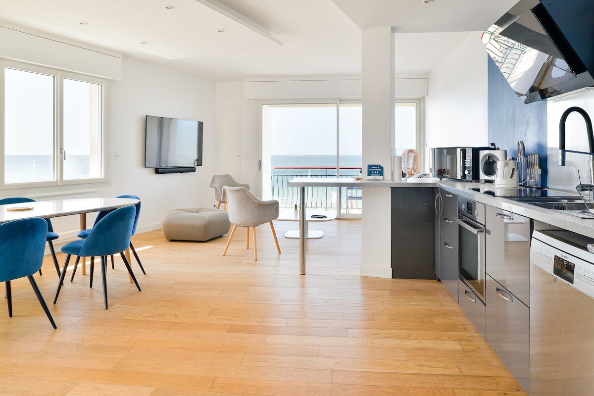 바다 전망 #생 나제르 100 평방미터의 멋진 최상층 고급 숙소. 2019년 6월에 새롭게 단장했습니다. 바다를 마주하고 있습니다... 아름다운 파사드가 있는 주택가로, 바다 앞 산책로, 어촌 근처의 생 나제르 다리 다리를 마주보고 있습니다. 이런 곳에 반하지 않을 수 없습니다. 3채의 주택만 있는 작은 건물의 2층에 있습니다. 이 아파트는 여러분을 매료시킬 것입니다. 현대적인 주방, 바다 전망의 침실 1개, 욕실, 화장실이 있는 아주 아름다운 거실/응접실. 매우 밝습니다.