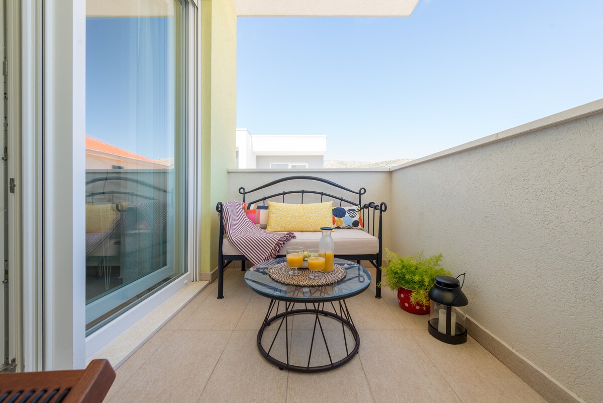Cozy studio with a stunning sea view with shared terrace. Located by the beach, just 2 km from Trogir, this small but fully equipped studio is a great base for your vacation in central Dalmatia. A beautiful pebble beach is right across the street — just a few steps away. The terrace is shared between two studios, with a designated area in front of each for private use. Please note that during peak season, street parking can be difficult to find, even further from the house.