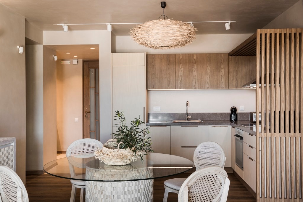 쿨하고 현대적이며 자연에서 영감을 받은 디자인으로 쌓인 돌 기둥 형태로 되어 있습니다. 전용 욕실이 있는 넓은(86평방미터) 2베드룸 빌라로 바닥에서 천장까지 이어지는 창문과 탁 트인 바다 전망을 자랑합니다. 내추럴 스톤 빌라는 평화로운 트라페자키 마을에 위치한 고급스러운 빌라입니다. 거실에는 매력적인 소파와 수영장과 바다 전망이 있습니다. 이 빌라는 최대 5명의 게스트를 수용할 수 있으며, 침실 2개에서 4명, 소파베드에서 1명 숙박할 수 있습니다.