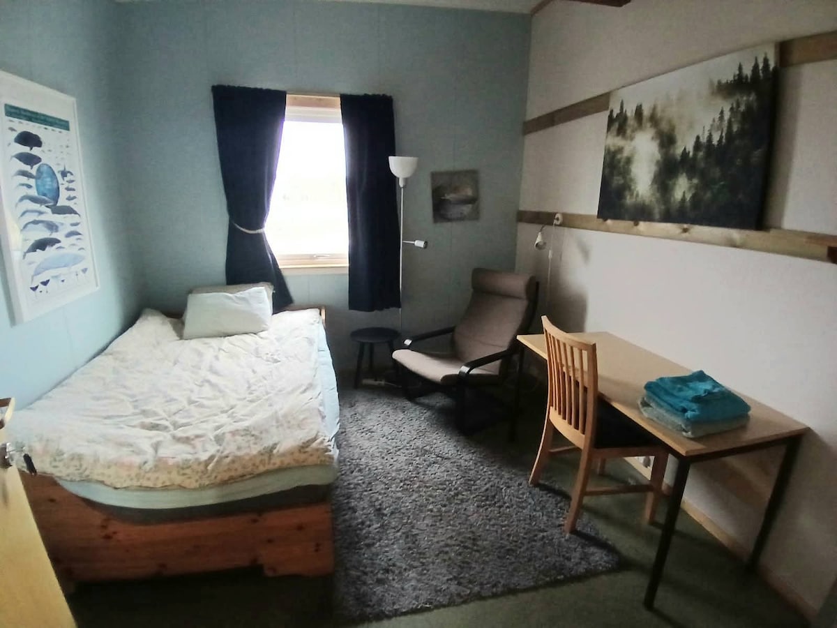 Your own private cabin, with the ocean right outside your window. Inside you find three bedrooms, a living room, kitchen and a bathroom. Go outside and enjoy the view from the sea side patio, complete with furniture and a campfire pan. Depending on the season and weather you can see eagles and other birds fly by, or just enjoy the stunning aurora. It´s a 3 minute walk to our small city center with grocery stores, sports shop, a liquor store, pharmacy, hair dressers and a gas station.