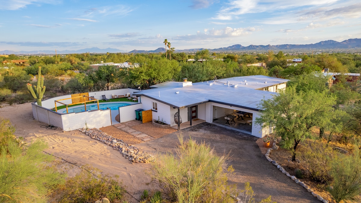 이 독특한 미드 센추리 모던 스타일의 숙소는 투손 중심부에 위치해 있으며 편의시설을 제공합니다! 이 숙소는 가족, 친구 및 반려동물을 위해 세심하게 꾸며져 있습니다. 수영장, 스마트 TV가 있는 파티오 공간, 그릴, 운동 장비, 탁구대, 게임, 복고풍 인테리어와 현대적인 기능을 즐겨보세요! 게스트는 정식 식사 공간, 넓은 뒷마당, 4개의 침실 중 3개에 있는 TV, 모니터/키패드가 있는 책상을 즐길 수 있습니다. 애리조나 대학교 및 DTWN까지 10분! 사막을 방문하기에 완벽한 숙소입니다!
