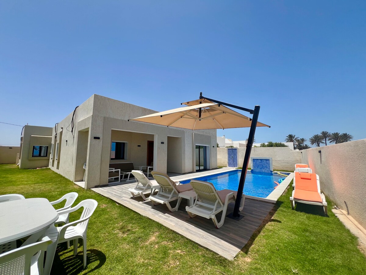 조용한 곳에 위치한 남향 전망의 저희 빌라에 오신 것을 환영합니다. 대형 전용 수영장, 어린이용 수영장, 넓은 거실, 시설이 완비된 주방, 휴식을 취할 수 있는 파티오, 바비큐, 아늑한 코너 등을 갖추고 있습니다... 여러분의 오락을 위한 보드게임이 준비되어 있습니다. 모스크에서 200m, 자동차로: 슈퍼마켓에서 2분, 해변에서 5분, 미둔 시내와 부르고 몰에서 15분 차량을 강력히 추천합니다.