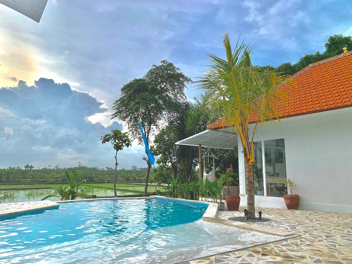 🌺 우붓 근처의 전용 열대 휴양지인 나렌드라 프라이빗 빌라 우붓에 오신 것을 환영합니다. 우붓 센터에서 불과 10분 거리에 있는 카틱 란탕에 위치한 이 아늑한 빌라는 무성한 녹지와 평화로운 논으로 둘러싸여 있습니다. 교통 체증과는 완전히 거리가 멀지만 카사 쿠란데라, 트로피컬 앤츠, 일라의 주방, 와룽 만디, 로나 와룽과 같은 인기 장소와 가깝습니다. 전용 수영장, 개방형 거실, 차분한 열대 풍경과 함께 프라이버시를 만끽하세요.
