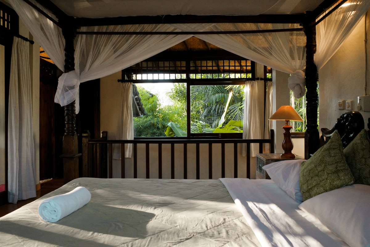 재생 목재로 제작된 앤티크 스타일의 방갈로로 따뜻하고 시대를 초월한 매력을 선사합니다. 발코니에서는 울창한 열대 나무와 신성한 사원의 지붕이 내려다보이며 평화로운 분위기를 자아냅니다. 전용 수영장, 시설이 완비된 주방, 야외 샤워 시설, 고요한 정원을 즐겨보세요. 페네스타난 빌리지 한복판에 위치하고 있으며, 카페, 레스토랑, 편의시설에서 5분 거리에 있으며, 우붓 센터까지 도보로 15분 거리에 있습니다. 발리에서 진정으로 기억에 남는 숙박을 즐길 수 있는 조용한 휴양지입니다.