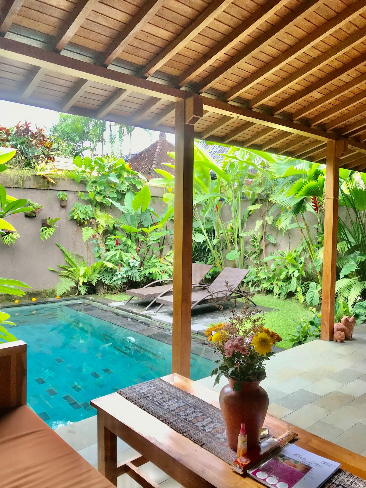Luxurious private villa with 6x3 meter pool. Secure, private, safe. Lush garden and sheltered but open air kitchen for dining and relaxing by the pool. Queen bed, outside tub and shower, with fish pond view, fully equipped kitchen. AC, TV, great WiFi, daily cleaning and set breakfast is included. We are an 8 minute walk from the main road, or a short scooter ride. This means peace and quiet, and no car noise. Our staff will be happy to drive you in by scooter if needs be.