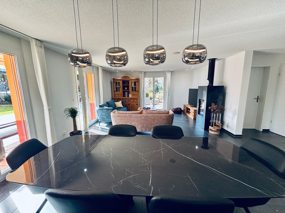 Private suite on the top floor of the owner-occupied Villa Wilen, directly on Lake Sarnen, unique alpine views, sunrises Spacious bedroom with home cinema, the panoramic lounge, large kitchen and bathroom (all privat area). For 3–5 guests, an additional private bedroom with bathroom is provided one floor below (lift access - shared area). Lake and garden access, SUPs, free parking & WiFi. Children welcome, small dogs only. Most popular Swiss Airbnb. Most highlights are reached within 1 hour.