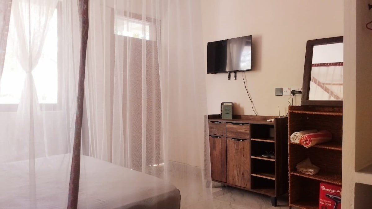 디아니 중심부에 위치한 침실 1개의 심플하고 미니멀한 인테리어 장식의 숙소입니다. 넓고 밝고 단기 또는 장기 숙박에 안성맞춤입니다. 거실에는 편안한 대형 소파 베드 의자, 평면 스크린 스마트 TV, 초고속 와이파이, 서재/작업 테이블로 사용할 수 있는 식사 공간이 있습니다. 시설이 완비된 주방, 침실에 있는 퀸사이즈 침대, 수건과 세면도구가 구비된 깨끗한 욕실. 천장형 선풍기가 설치된 높은 지붕, 추가 스탠딩형 선풍기, 제습기 및 공기 순환을 위한 대형 루브르 유리창.