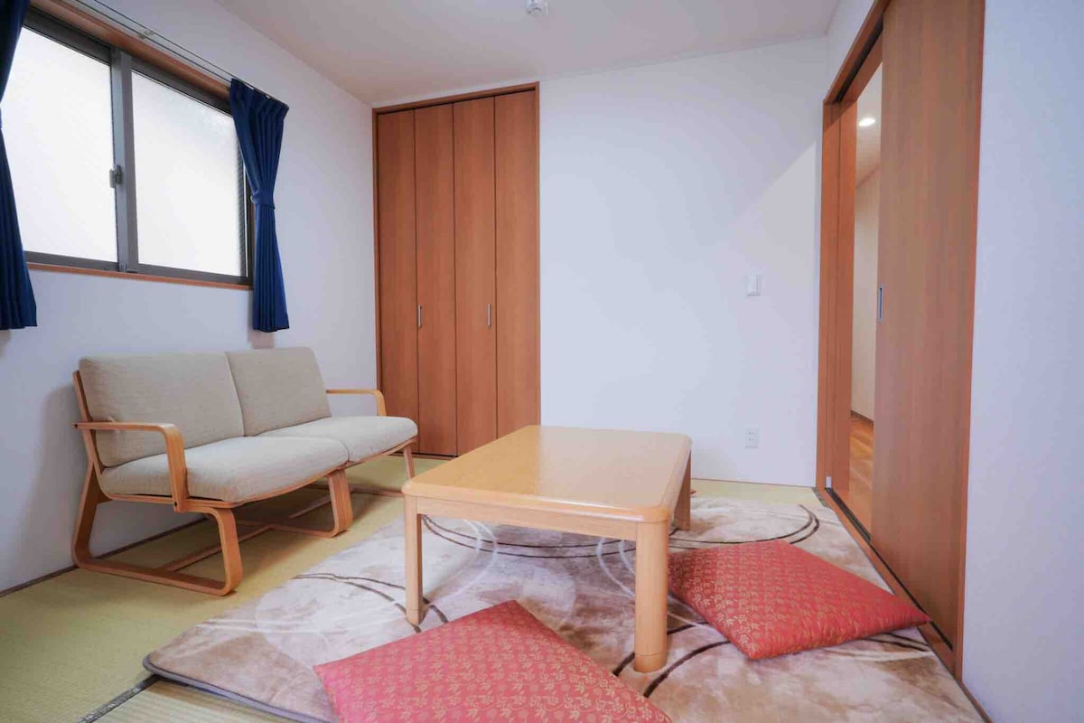 Renovated Kyoto townhouse (74 sqm) offers a surprising modern Japanese interior. The 2-story layout features a sunken kotatsu-style living room. Upstairs, 2 tatami rooms each have 2 beds: a bright double and a cozy single room. Ideal for families, this detached house ensures a peaceful stay. A 2LDK, it blends tradition with modern comfort.