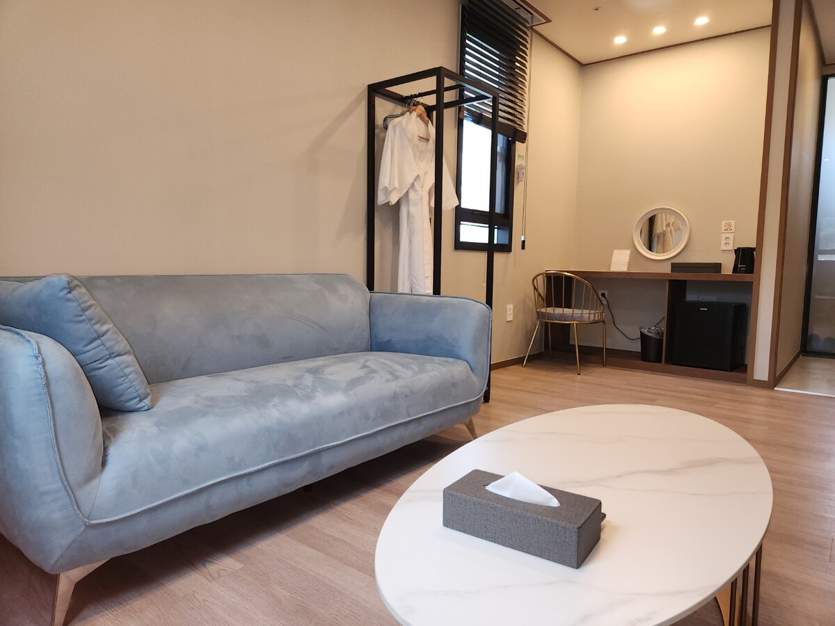 모던한 인테리어의 부띠끄 호텔입니다. 차로 10분 거리에 부산과 이어지는 기차역이 있으며, 시외/고속 버스터미널과도 근접하여 있어 이동에 편리합니다. *반려동물은 1박 당 1만원 추가요금이 발생합니다. (1마리 기준)