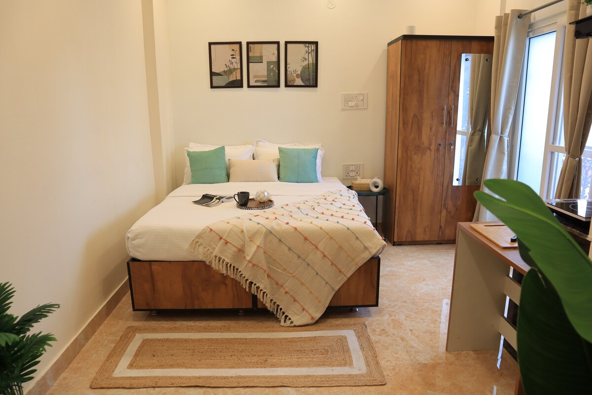 This Airbnb is in one of Bangalore's most desirable areas, Lavelle Road. This spacious & elegant studio unit is 450 sqft and is on the 2nd floor. The building has a lift. Cars can easily be parked in the basement. Guests can access the common spaces and the terrace of the building which has a great view of the Bangalore skyline. Guests can also order groceries, food, etc. on Zepto, Swiggy, Instamart and it will be delivered right to the doorstep.