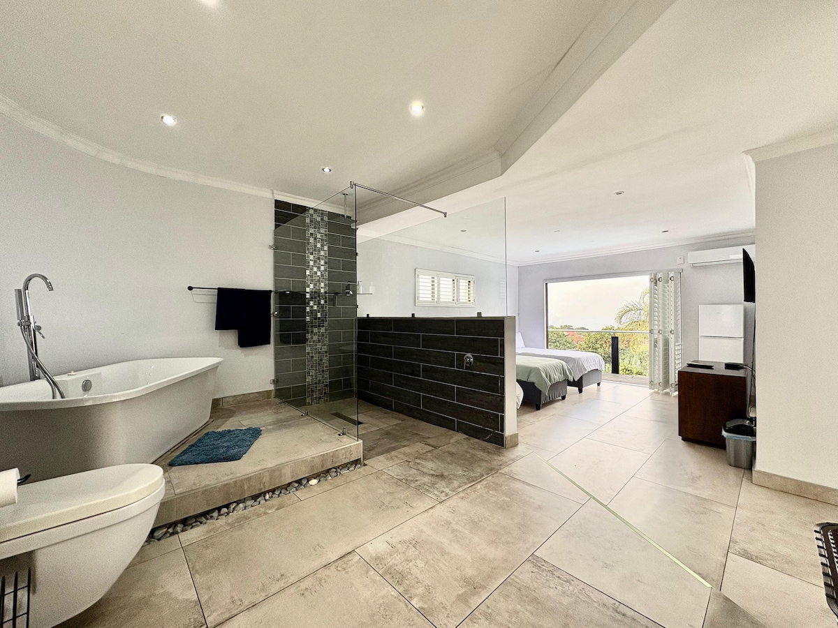 Our Beautiful Self Catering studio is situated on our property and is very private, comfortable with amazing views. It has full DSTV, Wifi, Aircon, Secure Undercover parking, Pool, and a Private entrance. Close to Shopping Malls, Restaurants, Beaches and is 15 minutes drive from King Shaka International Airport. We provide tea,coffee,milk, yogurt and muesli. The kitchen has, a mini oven, microwave, kettle,fridge, toaster. We can accommodate a YOUNG CHILD Only, NOT 3rd ADULT on a small bed!