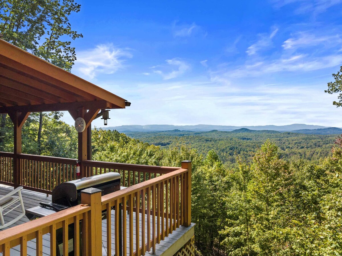 Retreat to the mountains and step into Cascading View Lodge where you will be greeted with incredible long-range mountain views. This luxury cabin is <20 min from downtown Blue Ridge. Come take in the mountain views on our screened in porch and spacious deck. We offer a fire pit underneath the stars and hot tub to enjoy with family and friends! For your comfort we offer 5 smart TVs, high speed WiFi, game room with arcade game and more, and a fully stocked kitchen! Let us help you plan your trip!