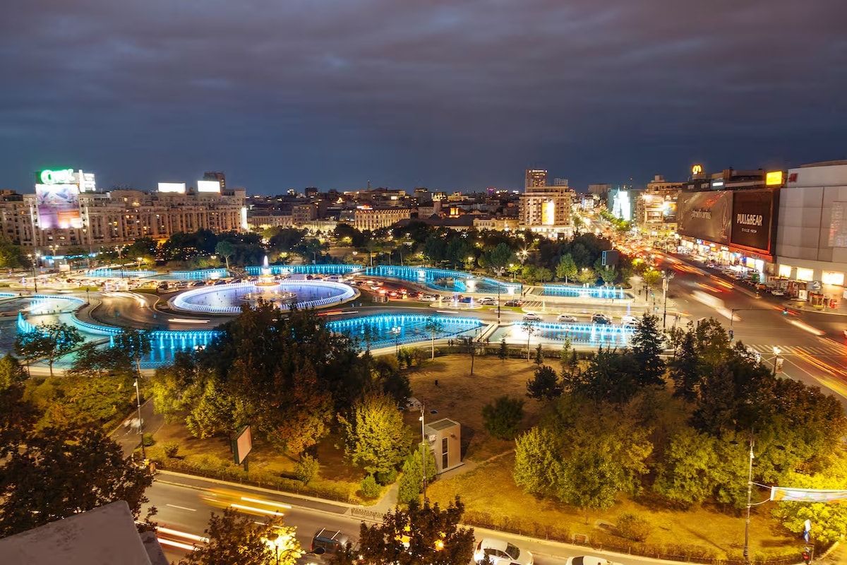 This is the best located apartment in the center of Bucharest. You have an amazing view of the Dancing Fountains, you are a 5-minute walk from the Historical Center where you have cafes, clubs, restaurants; you are a 6-minute walk from the largest building in Europe - the Parliament; you are a 2-minute walk from the Metropolitan City of Bucharest and you also have an extraordinary view over the city. Unirea mall and restaurants on the banks of the Dambovita river are a 3-minute walk away.