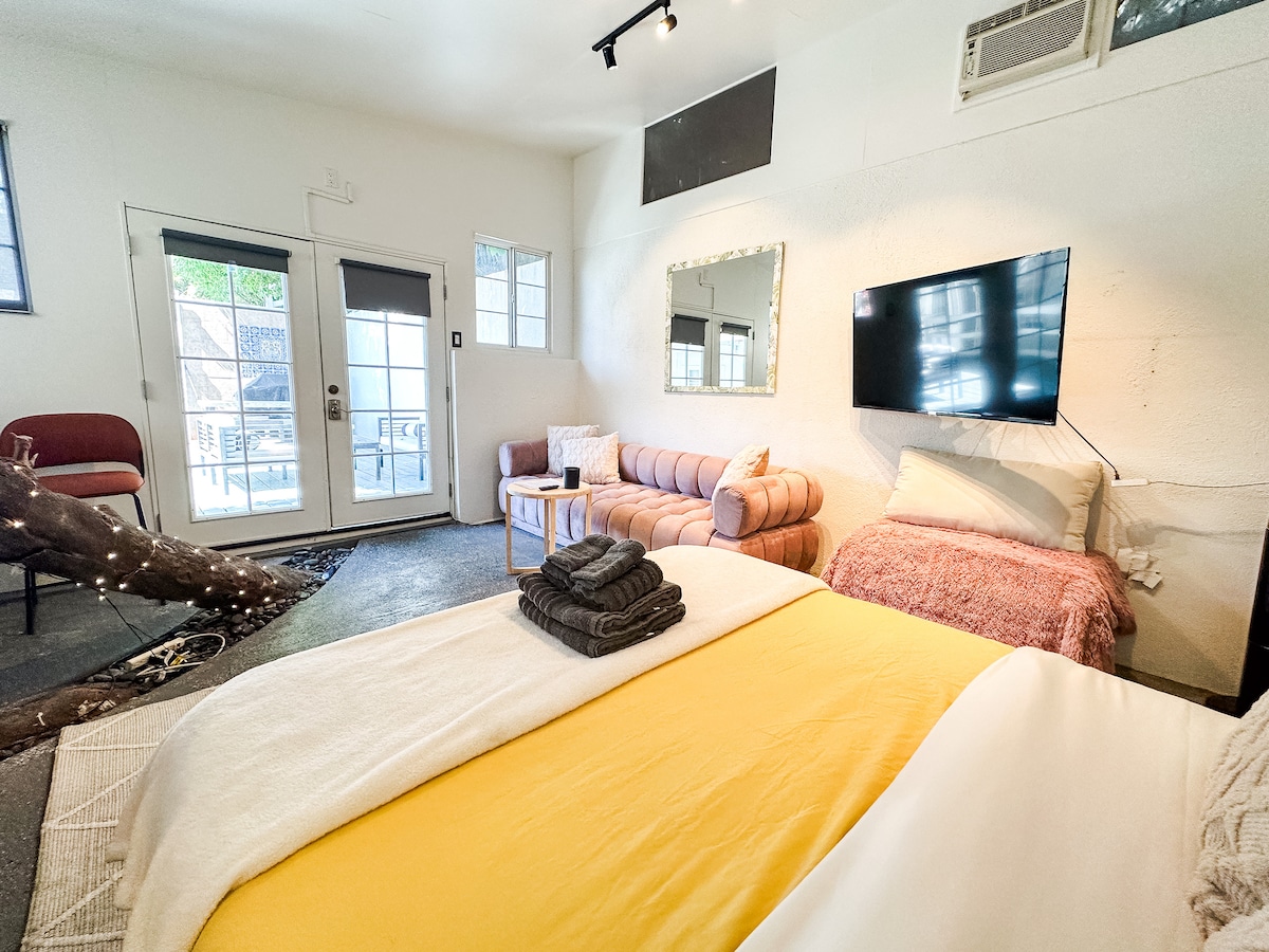 Welcome to your LA retreat! This chic studio apartment in Burbank is just minutes away from Universal Studios, Burbank Studios & Disney. This space offers effortless living. Enjoy stylish furnishings, a fully-equipped kitchen, Wi-Fi & a smart TV, queen beds, on-site laundry, street parking, & ongoing support, convenience is assured. Located across from Whole Foods. You’re at the heart of LA’s vibrant culture. Show up & live the LA dream! Easy Free Street Parking.