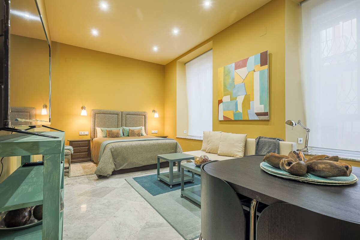 This 83 sqm apartment is ideal for up to 6 people. The space features comfortable king-size (180x200) and queen-size (160x200) beds, a spacious living area and a colourful private terrace. The living area evokes Mediterranean vibes, thanks to warm furniture colours and wooden dining tables. For maximum comfort, lay on the private terrace, hold a glass of tinto de verano and enjoy Sevilla’s warm nights. The apartment also includes an equipped kitchen and a spacious bathroom.