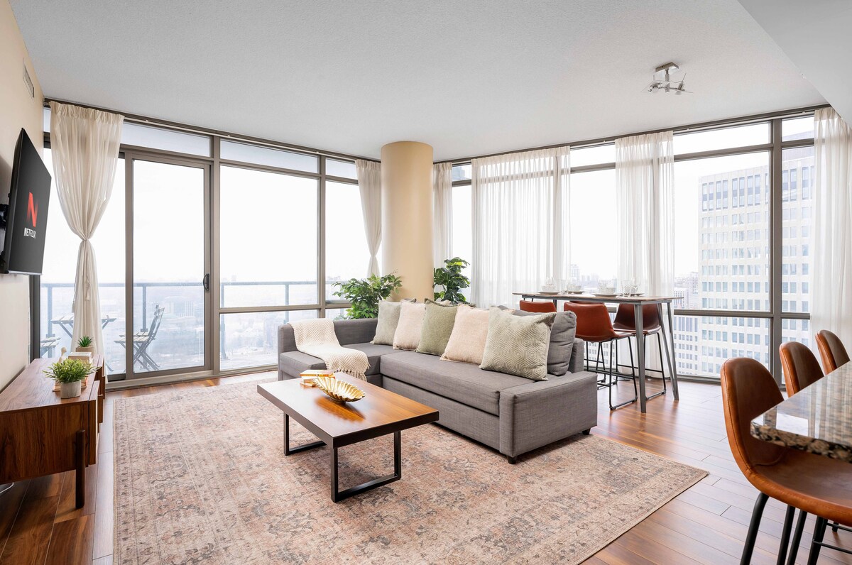 토론토 도심 한복판에 위치한 침실 1개의 고급스러운 고층 휴양지에 오신 것을 환영합니다! 베이 & 칼리지에서 몇 걸음 거리에 있습니다. 마음에 드실 만한 점: • 도시 스카이라인 전망이 보이는 높은 층 • 매우 높은 천장 및 전면 높이 창문 • 풍부한 자연광이 들어오는 밝고 쾌적한 공간 • 주방 시설 완비 및 숙소 내 세탁 시설 • 초고속 와이파이 및 스마트 TV • 보행 지수 99 – 지하철, 토론토 대학교, 이튼, 레스토랑 모두 몇 분 거리에 있습니다. 훌륭한 위치에서 최고의 편안함을 원하는 커플 또는 솔로 여행객에게 적합합니다.