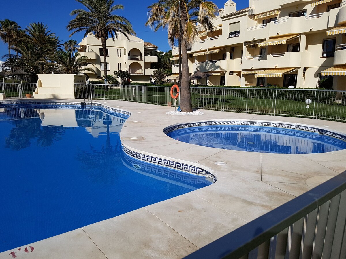 Fresh and bright apartment with sea views ideally located within few minutes walk to all amenities of popular La Cala town: bars, restaurants, supermarket, La Cala town centre, bus stop and best sandy beaches in the area with beautiful boardwalk along the seashore. No car is needed. Very comfortable apartment, quality beds, spacious living room with high ceilings and access to sunny terrace with fantastic sea views! new AC units in every room, Wi-Fi, smart TV. Lovely outdoor pools.
